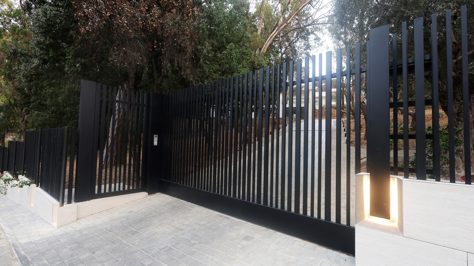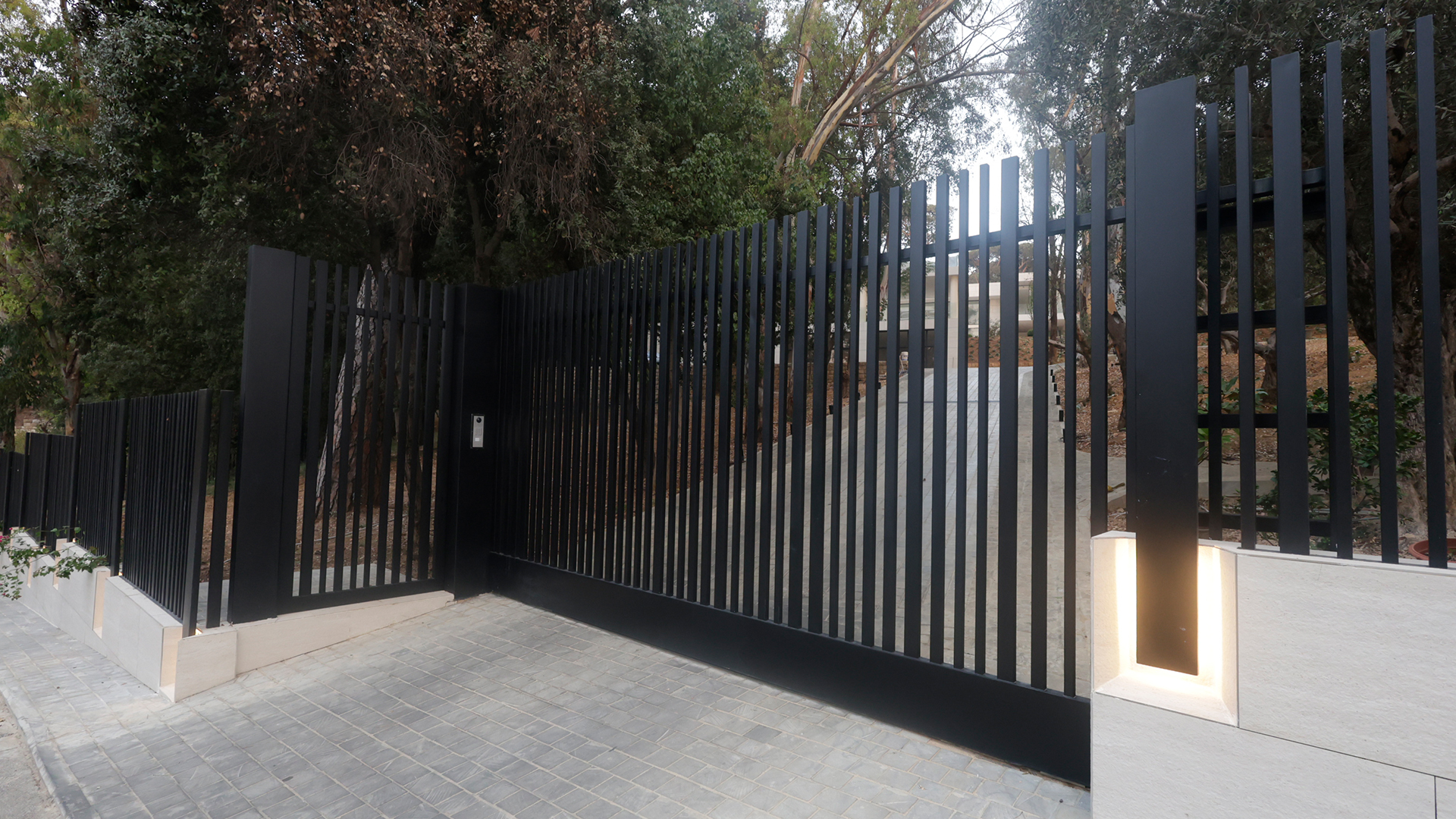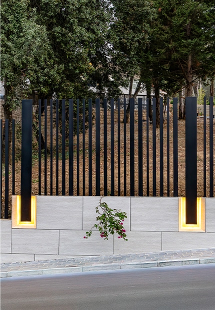SIMTEC successfully delivered this automated sliding gate system in powder-coated matte black steel, enhanced with integrated LED lighting and refined stone detailing. This installation blends contemporary architectural elegance with long-lasting structural resilience.
